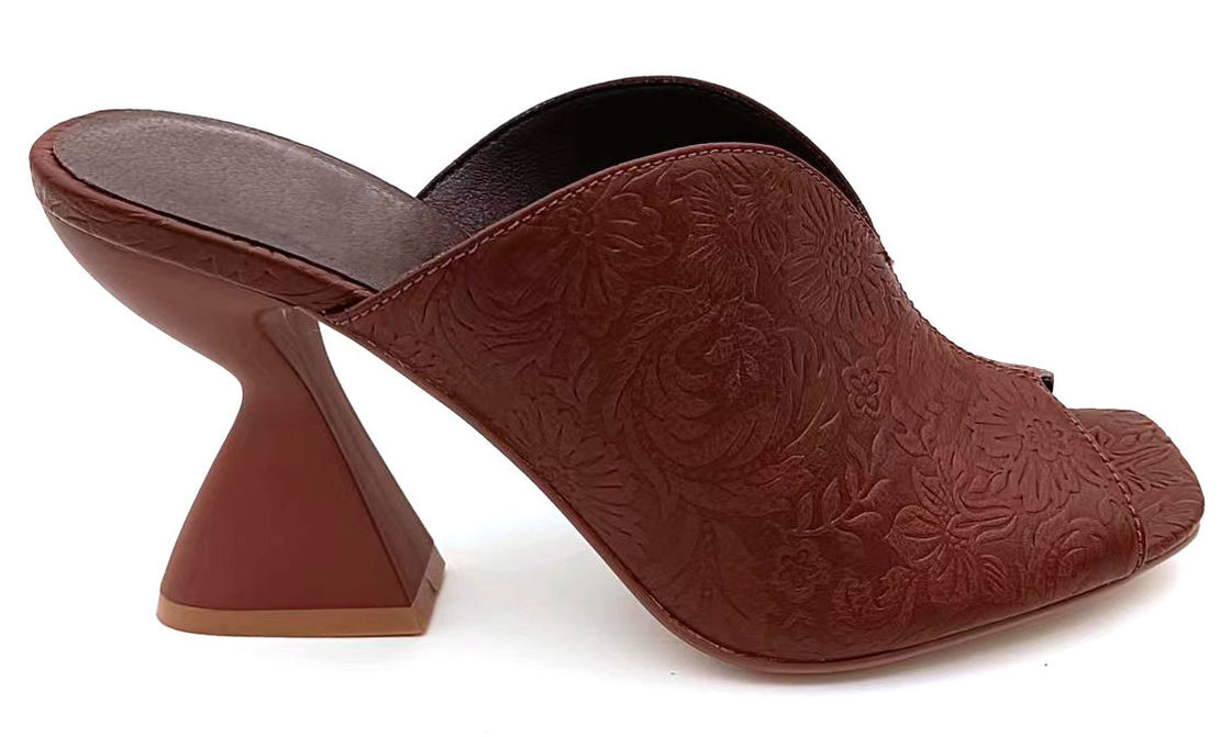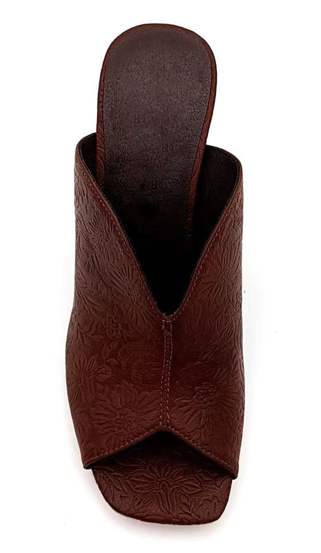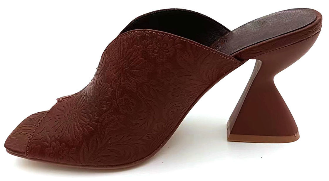 Nowoczesny wielki muł w stylu francuskiej kolce, wykonany z kwiatowego wzoru PU, z górną linią w kształcie litery V, kwadratowym palcem i stylem ślizgowym.